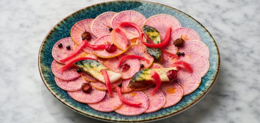 This is a bright, crunchy, vinegar-marinated vegetable carpaccio paired with lightly cooked mackerel — very fresh and elegant!