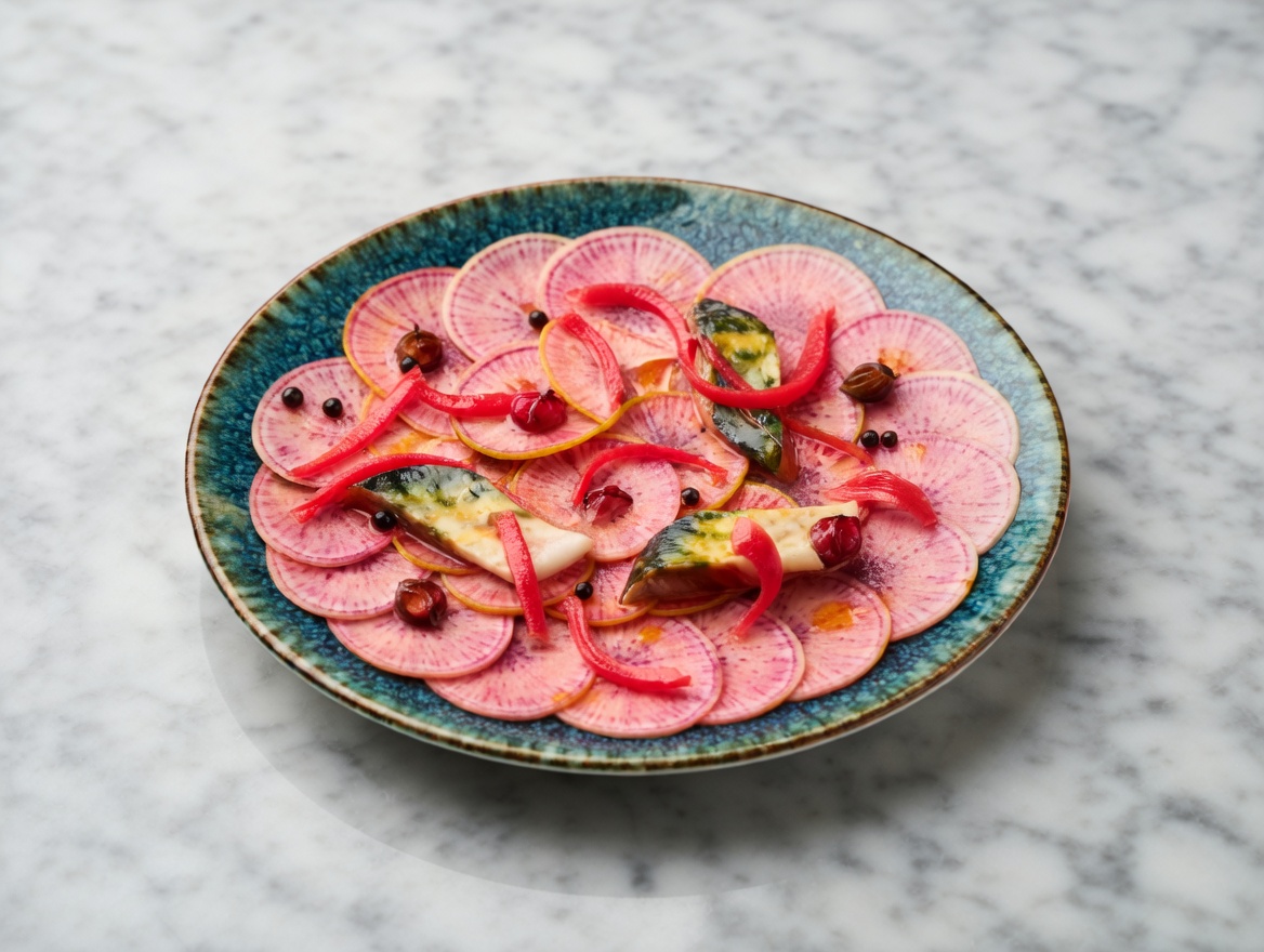 2. **Prepare the vegetables for the carpaccio:** Peel the radishes, carrot, and red onion. Slice them very thinly (ideally with a mandoline). Place in a bowl.