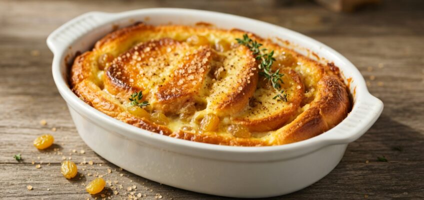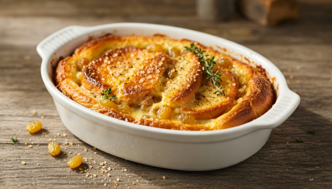 Step 4: Add custard and bake Pour the custard evenly over the bread layers, pressing the bread down gently so it absorbs the custard. Sprinkle the top generously with demerara sugar and freshly grated nutmeg. Bake for 40–50 minutes until the top is golden brown and crisp, and the custard is just set but still slightly wobbly in the centre.