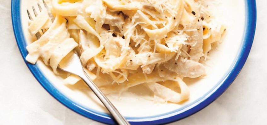In the saucepan that was used to cook the pasta, bring the cream, cheese, and remaining butter to a boil, stirring with a wooden spoon. Add the pasta, chicken, and 60 ml (¼ cup) of the cooking water. Warm the pasta through and stir until it absorbs the liquid. If necessary, add more cooking water, if the pasta is too sticky. Taste and adjust the seasoning.