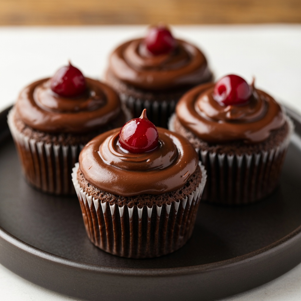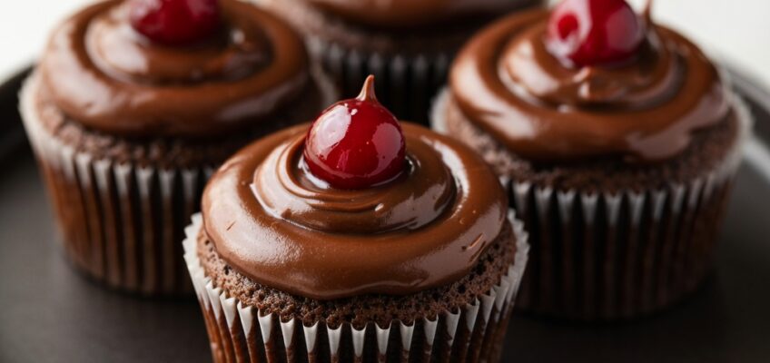 Enjoy these rich, moist chocolate cupcakes with a lovely cherry flavour and glossy chocolate icing!