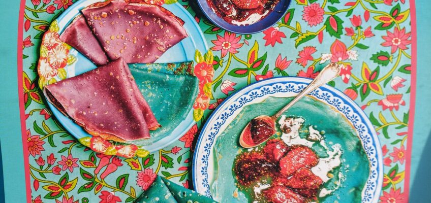 Enjoy your beautiful, colorful crepes with gourmet fig jam! Perfect for a fun brunch, kids, or a themed Chandeleur (Crepe Day). 🥞💜💙