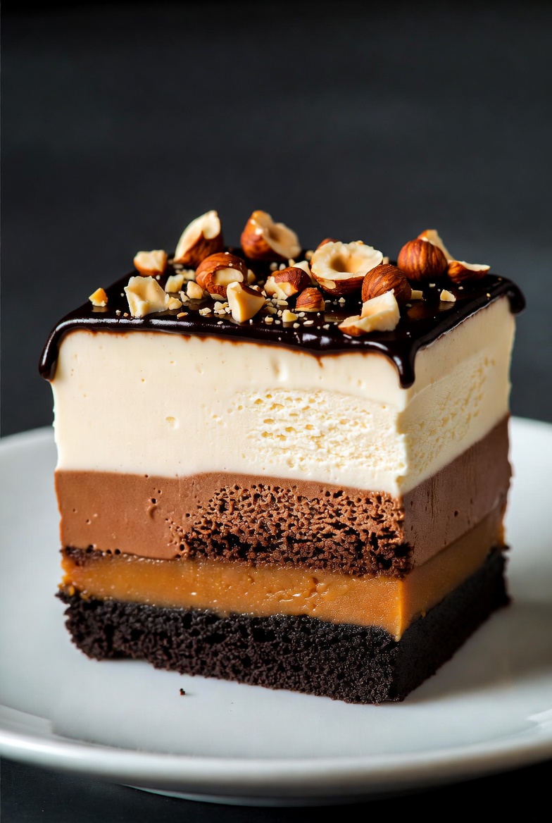 - In a bain-marie (double boiler), melt the remaining chocolate. Drizzle or spread it over the top of the cake. Sprinkle with chopped hazelnuts. Return to the freezer briefly to set.