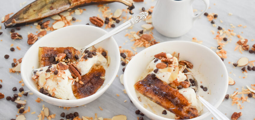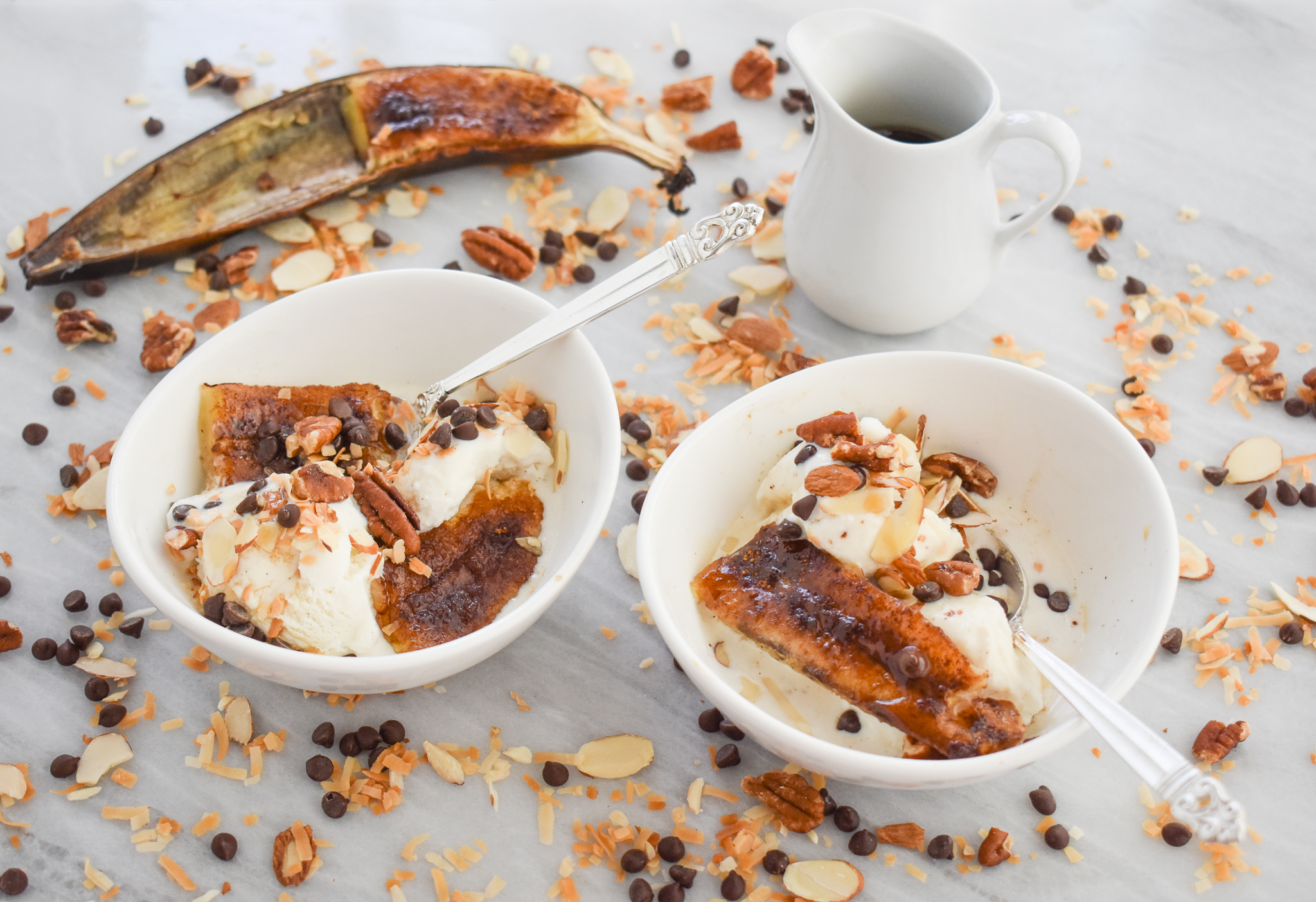 Slice 1 banana into rounds. Sprinkle with 15 ml (1 tbsp) sugar. In a skillet over medium-high heat, cook in a little butter until caramelized. Serve warm over the frozen yogurt, optionally with a sprinkle of cinnamon.