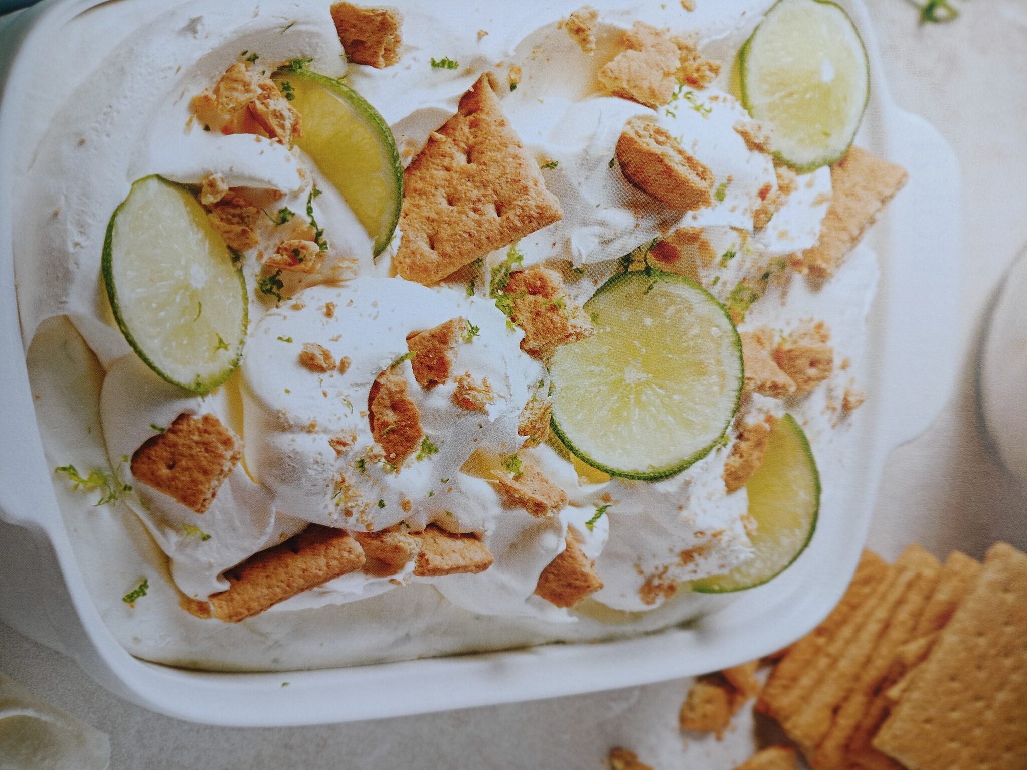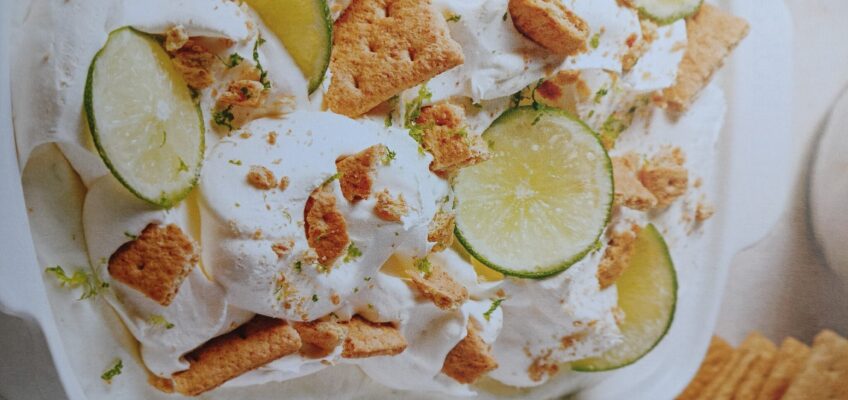 Top with the reserved whipped cream, crushed graham crackers, and lime slices.