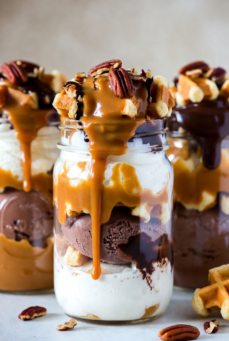 This is an indulgent, layered ice cream sundae in jars, featuring caramel and chocolate sauces, pecans, waffle pieces, and multiple ice cream flavors.