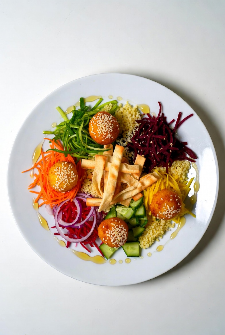 - Fluff up the couscous with a fork. In a large serving platter, toss the grated vegetables with the couscous. Drizzle with the dressing and mix gently. Scatter the crispy pita strips on top, then arrange the warm sesame feta fritters over the salad. Serve immediately.