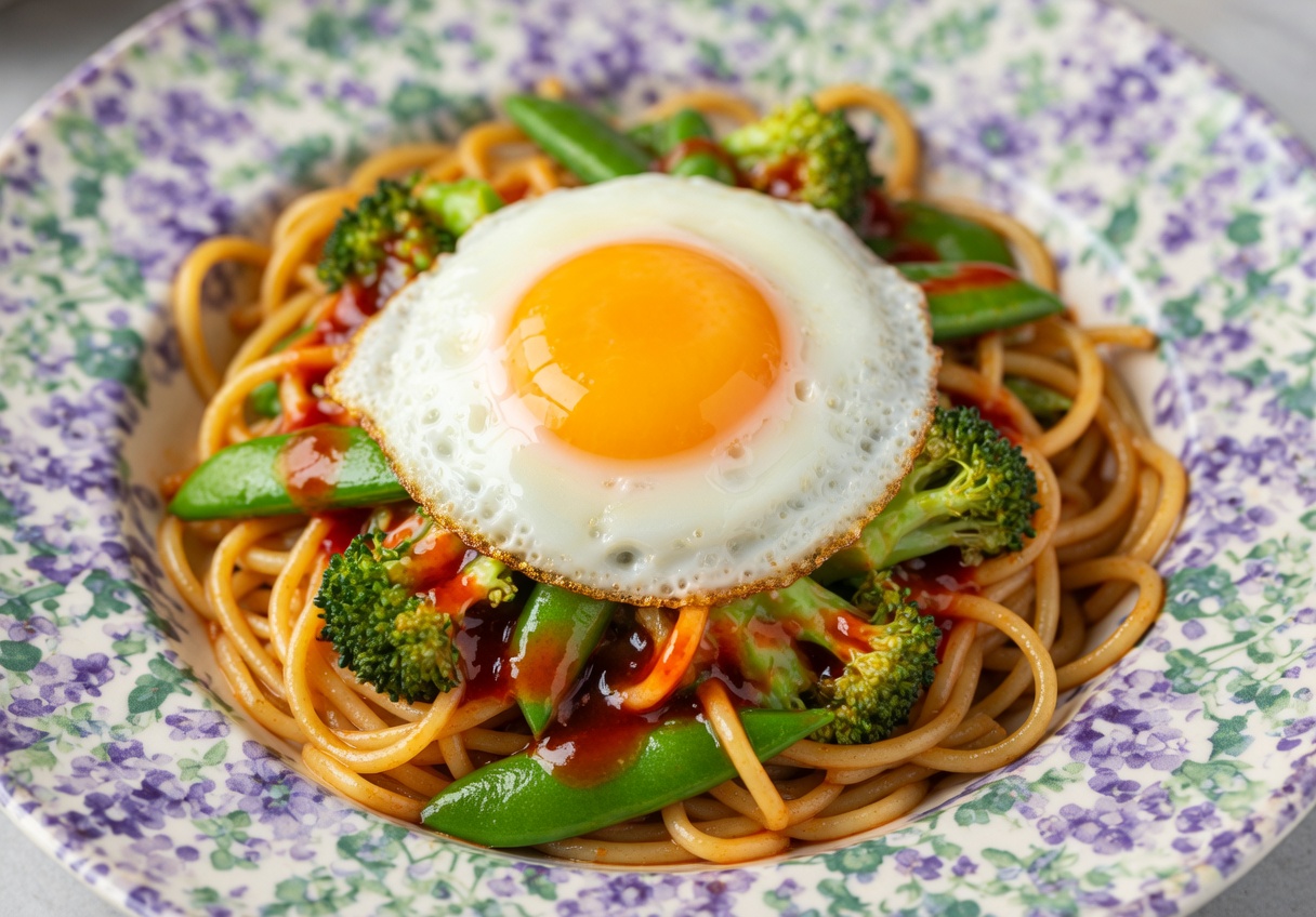 - Serve: Divide the dressed noodles and vegetables between 4 bowls. Top each with a fried egg. Drizzle generously with hot chili sauce and serve immediately.