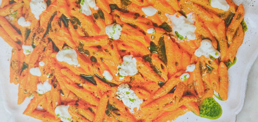 Enjoy! This is a quick, creamy, flavourful vegetarian pasta dish thanks to the roasted pepper sauce.