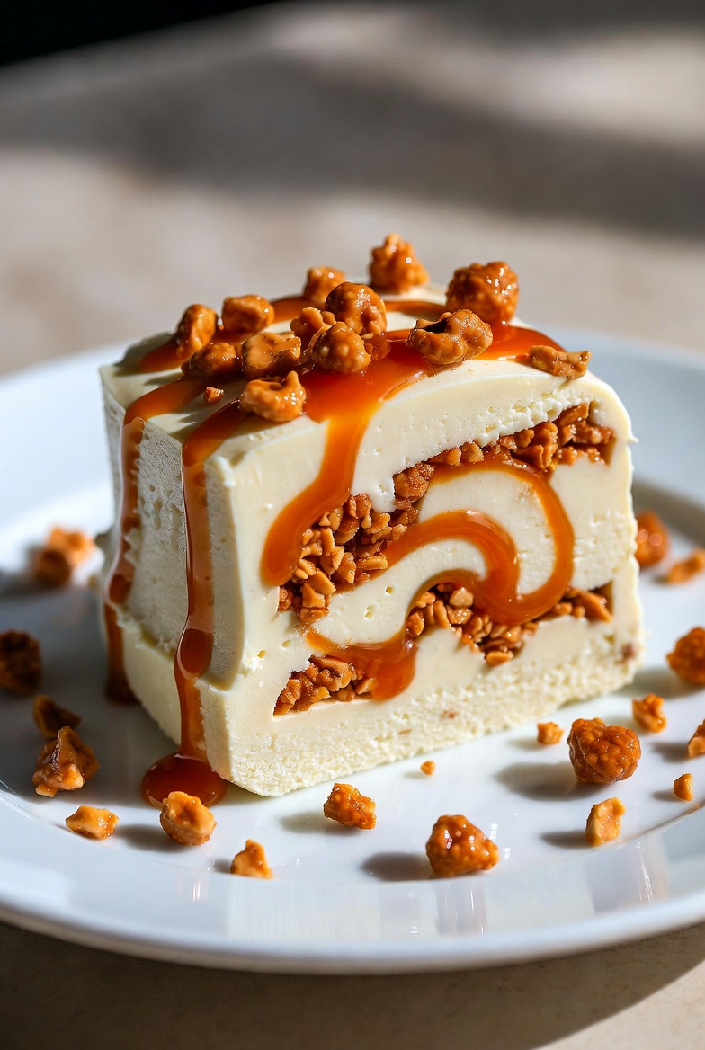 Remove from the freezer 10–15 minutes before serving to soften slightly. Unmold onto a plate, remove the plastic wrap, and slice. Serve with extra caramel sauce and pralines on top or on the side.
