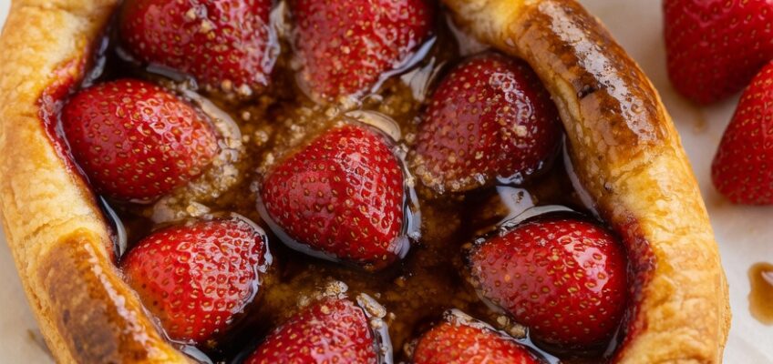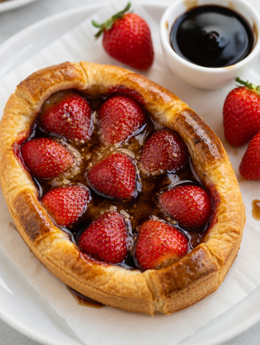 - Remove the stems from the strawberries, keeping them whole. Mix them with the balsamic vinegar cream, powdered sugar, and cornstarch. Sprinkle the almond powder in the center of the pastry, then arrange the strawberries on top along with their syrup.