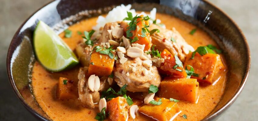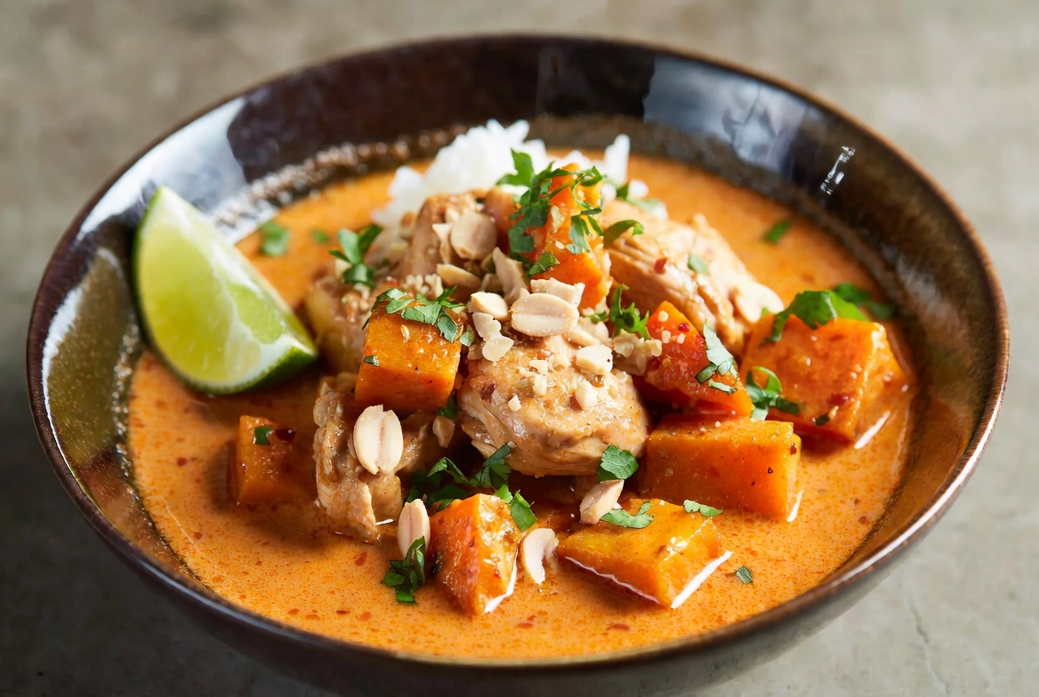 1. In a slow cooker, combine the chicken, squash, coconut milk, ginger, red curry paste, tomato paste, kaffir lime leaves (if using), brown sugar, garlic, fish sauce, soy sauce, and salt. Cover and cook on low for 5 to 6 hours or until the chicken is tender and starts to fall apart.